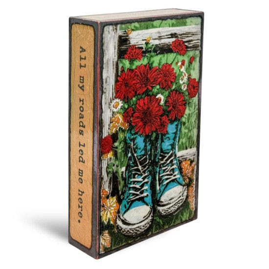 Introducing our #304 Journey decor from Houston Llew's collection. This beautiful piece of artwork features sourced copper, glass enamel, and a custom wood box frame. This gorgeous piece measure 8.5" x 5.25" x 1.75" and weighs 2.5 lbs. Add a special touch to any room with this piece.