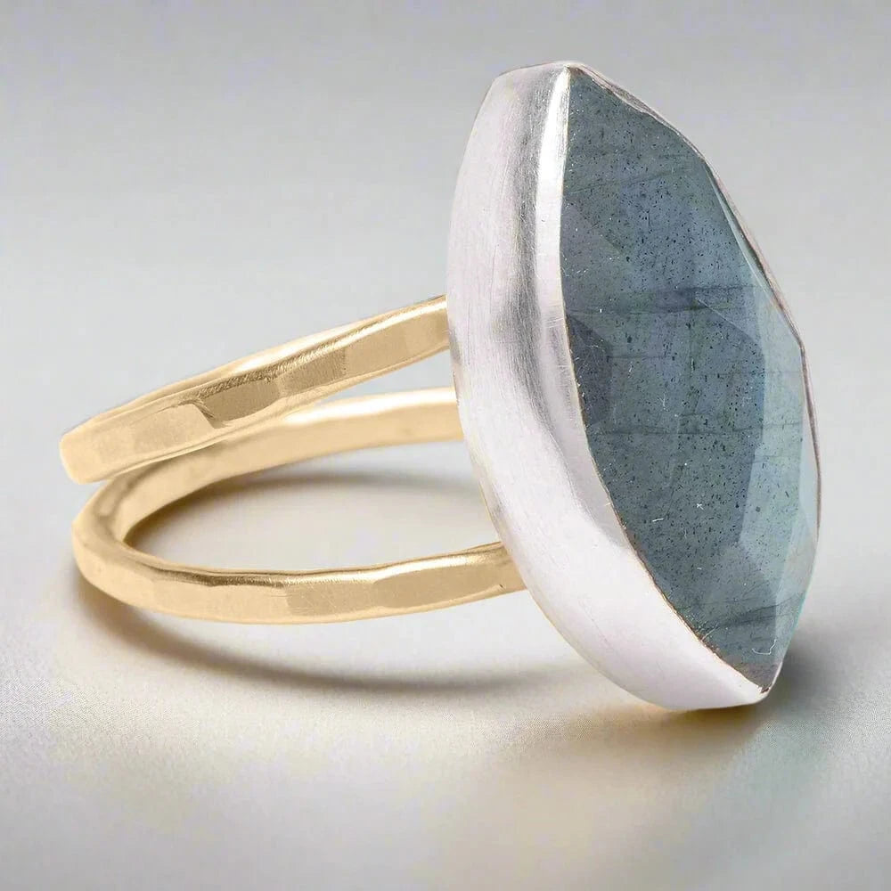 This stunning labradorite marquise ring is a true statement piece, blending artistry with natural beauty! The faceted gemstone shimmers with flashes of color, catching the light from every angle and showcasing the stone’s unique character. It is carefully set in a sleek sterling silver bezel, which rests gracefully atop two hammered gold-filled bands, adding both texture and contrast!