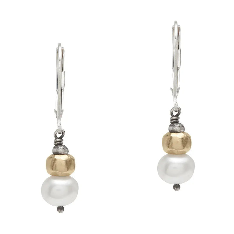 Exude effortless elegance with these stunning earrings. Lustrous 6mm white pearls are accented with oxidized sterling silver and vermeil beads, hanging from sleek sterling silver leverback clasps. Carefully crafted, they add a touch of sophistication and polish to any outfit!