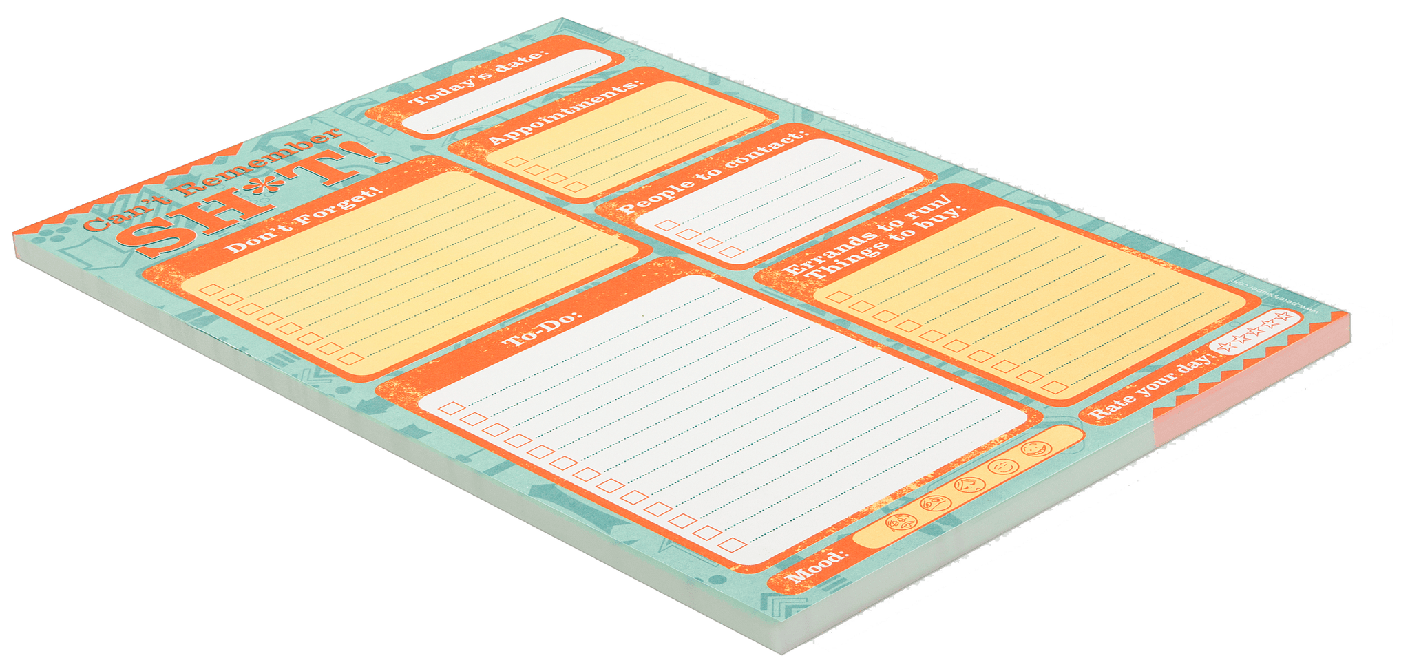 Get things done with this irreverent Can’t Remember Sh*t to-do pad! Jot down tasks, appointments, errands, and your daily mood, then check them off in style. 60 tear-off sheets of thick paper, 6" x 9", perfect for home, office, or on the go.