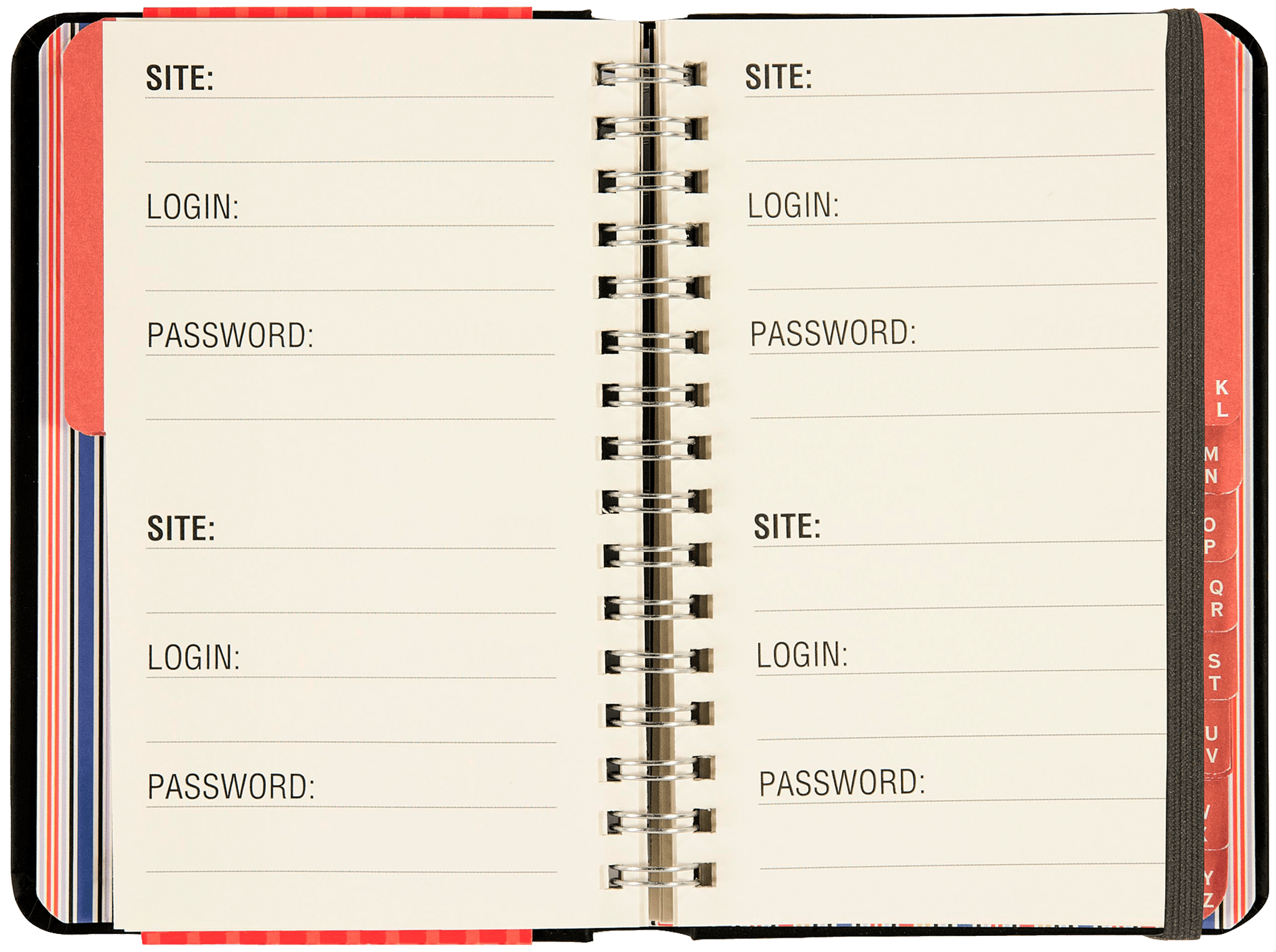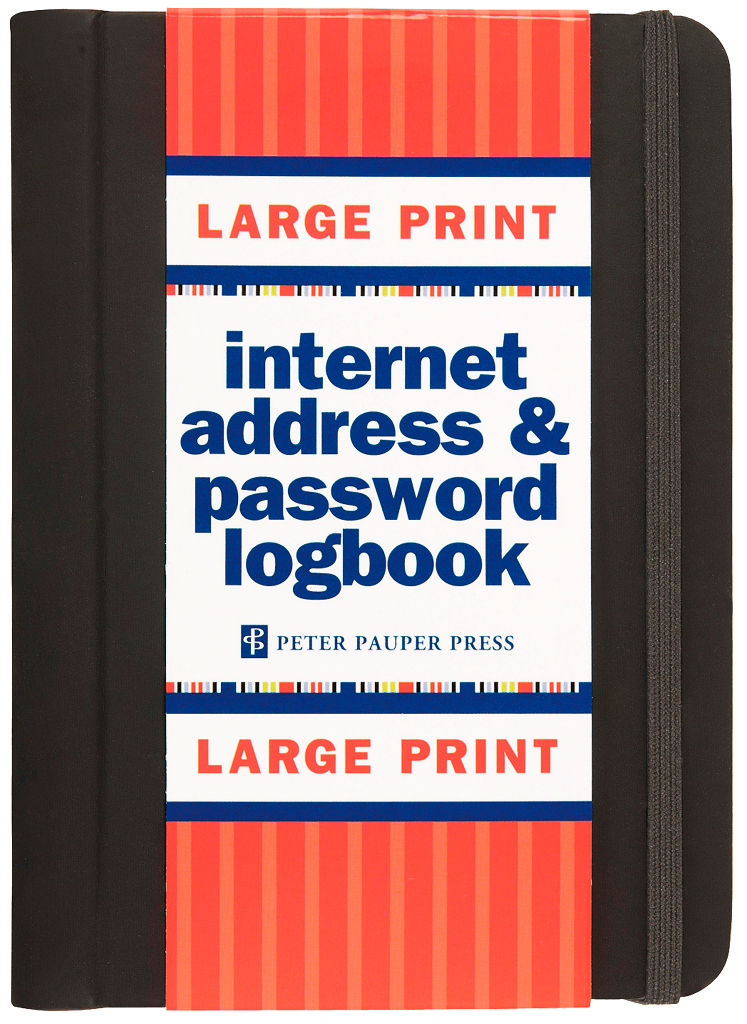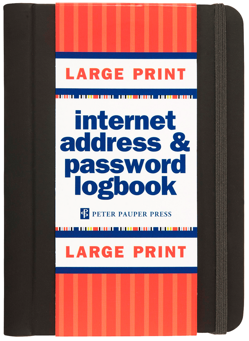 Your improved online password organizer is here! With larger, easy-to-read type and extra space, this 144-page logbook makes it simple to record websites, usernames, passwords, and notes. Includes tabbed A-to-Z pages, extra sections for network or software info, a discreet black cover with removable label, elastic closure, and concealed wire-o binding that lies flat. Compact at 4¼" x 5¾", perfect for home or office use.
