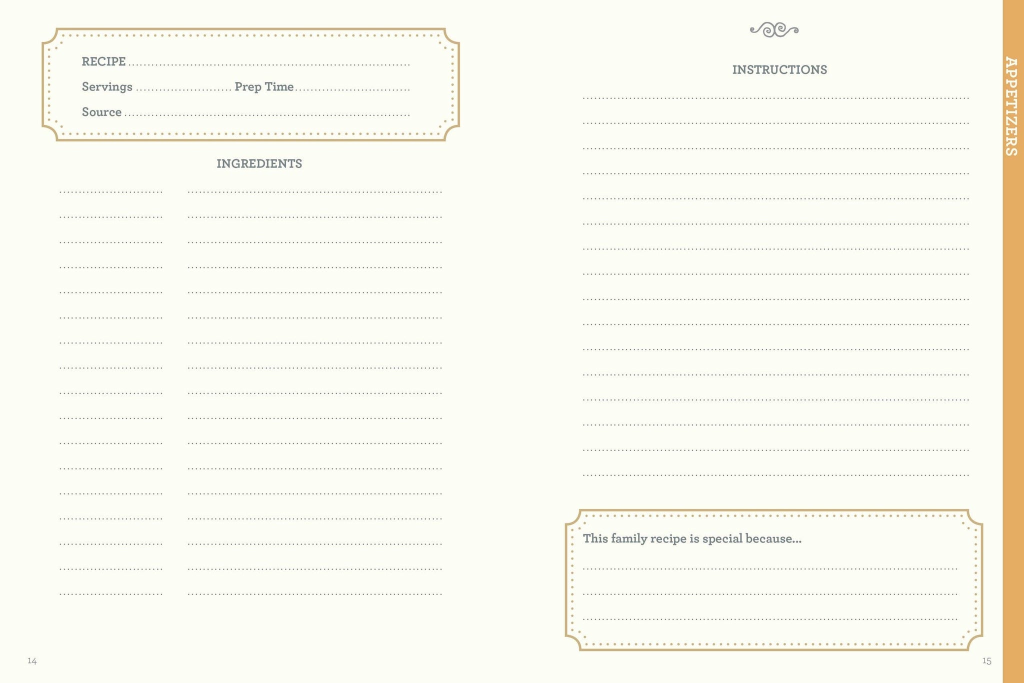 Preserve and organize your family’s favorite recipes in this beautiful recipe journal. Record the recipe, its source, and why it’s special to create a treasured collection of memories. Includes sections for appetizers, soups, salads, sandwiches, sides, mains, desserts, beverages, and more, plus measurement equivalents, substitutions, kitchen tips, and a cooking glossary. Features a ribbon bookmark, inside back pocket, and sturdy hardcover. 144 pages, 6¼" x 8¼".