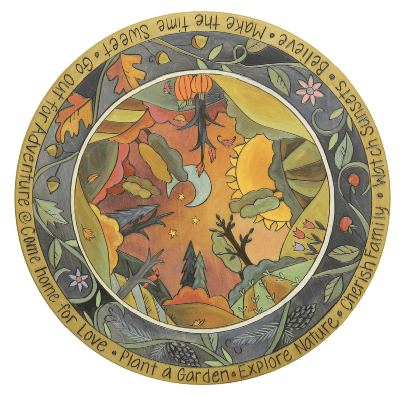 Host in style with the Golden Hour Lazy Susan! This 18"D beauty features a charming four seasons design with a mild winter and a colorful vine border, printed with love in Des Moines. Plus, the durable multi-coated finish with low VOC water based polyurethane means just a little soap and water is all you need to for clean up.